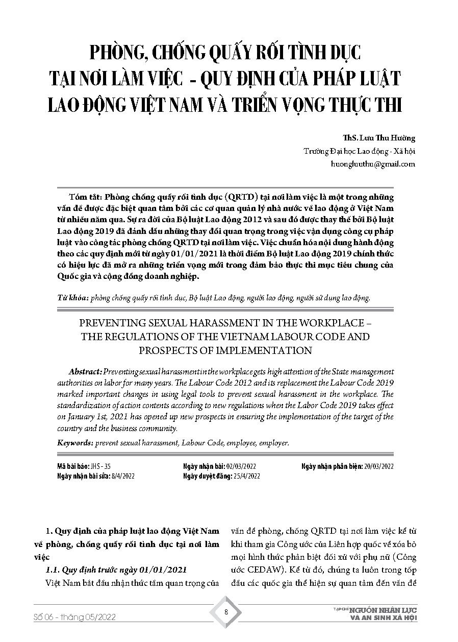 Phòng, chống quấy rối tình dục tại nơi làm việc - quy định của pháp luật lao động Việt Nam và triển vọng thực thi = Preventing sexual harassment in the workplace – The regulations of the Vietnam’s labor code and Prospects of implementation