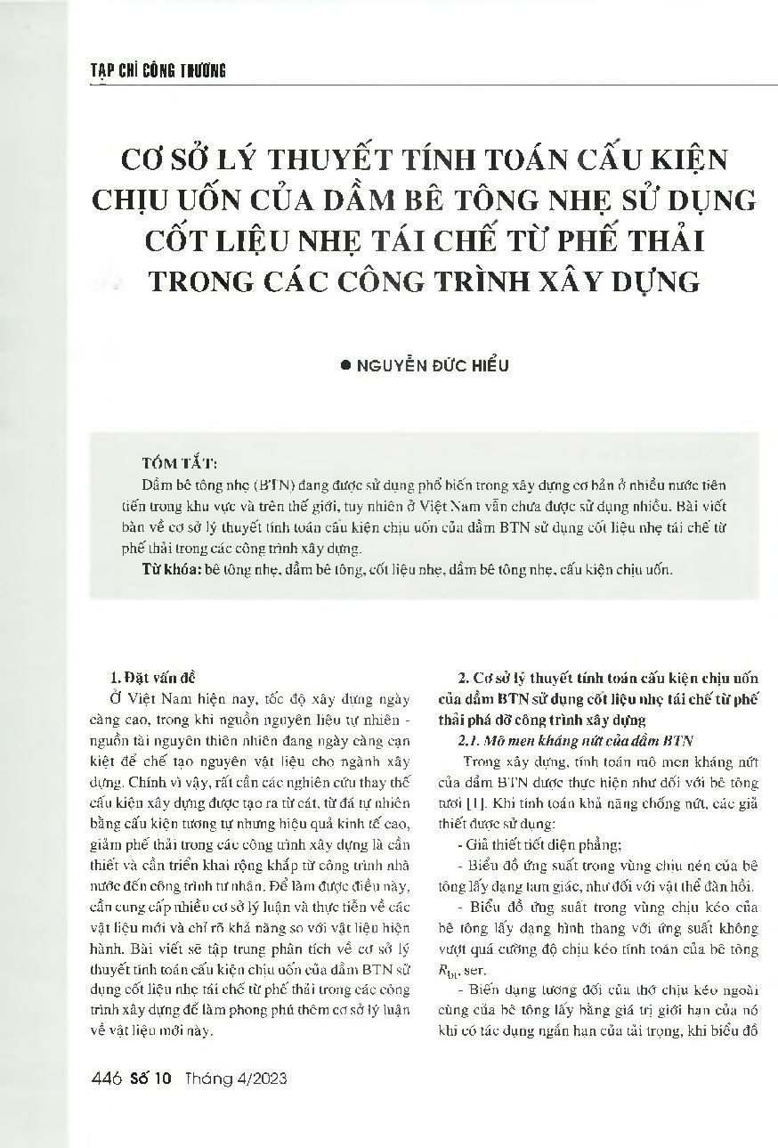 Cơ sở lý thuyết tính toán cấu kiện chịu uốn của dầm bê tông nhẹ sử dụng cốt liệu nhẹ tái chế từ phế thải trong các công trình xây dựng