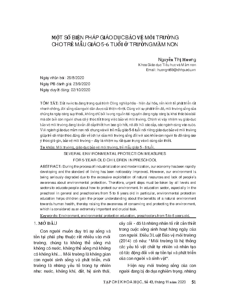Một số biện pháp giáo dục bảo vệ môi trường cho trẻ mẫu giáo 5 - 6 tuổi ở trường mầm non = Several environmental protection measures for 5-6 years old children in preschool