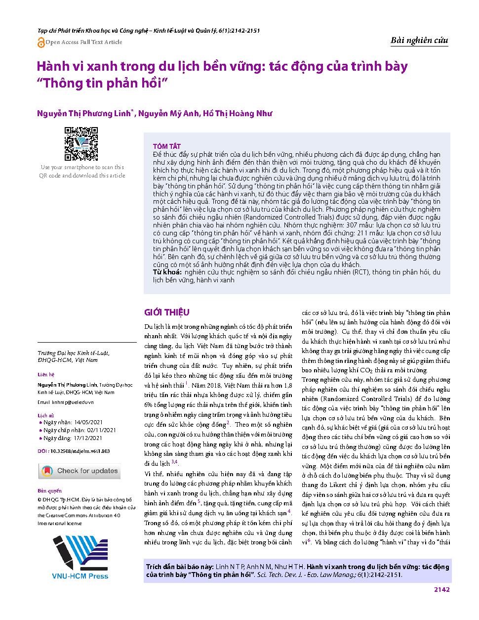 Hành vi xanh trong du lịch bền vững: tác động của trình bày “Thông tin phản hồi” = Pro-environmental behavior in sustainable tourism: the impact of using ”Environmental feedback”