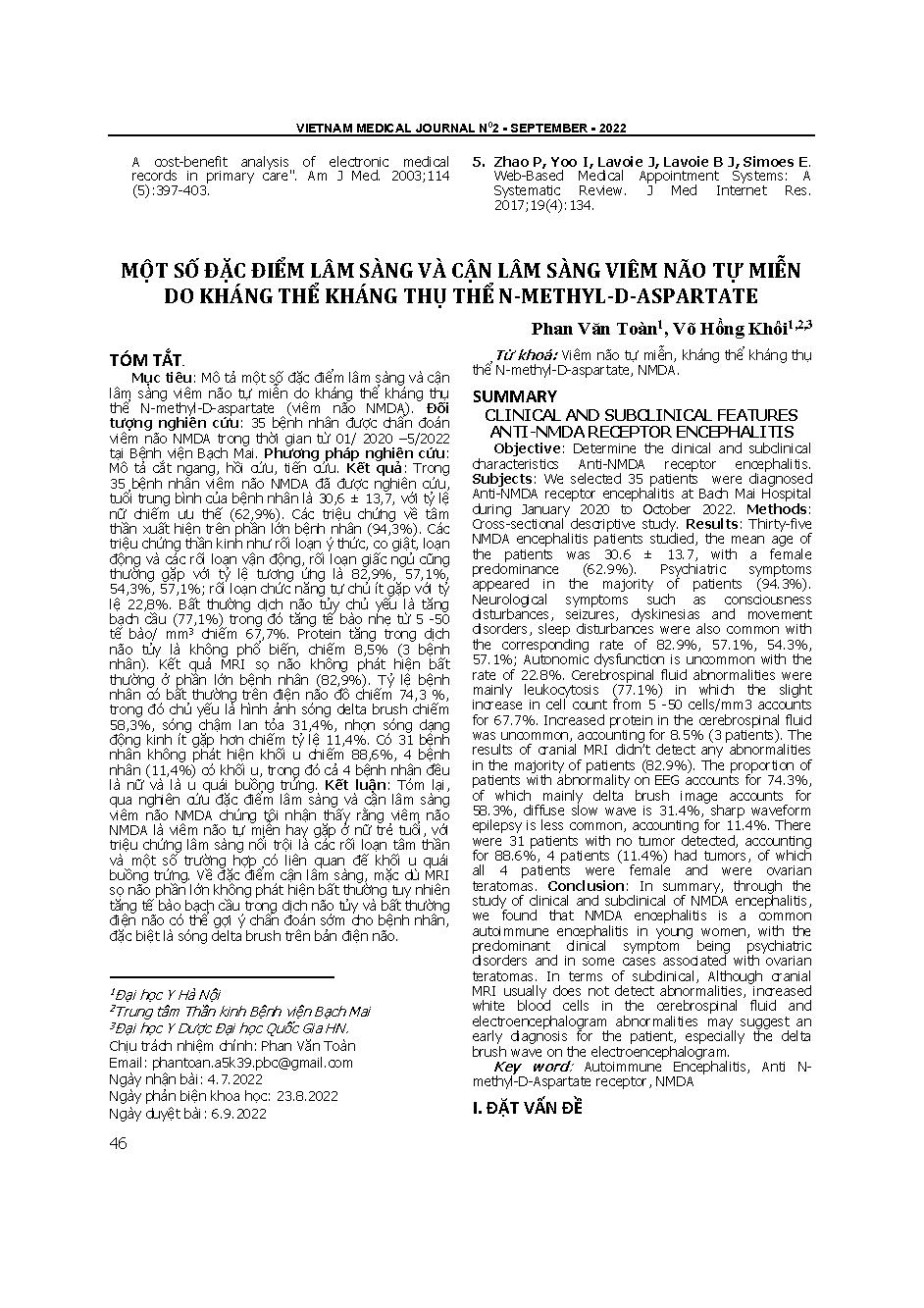 Một số đặc điểm lâm sàng và cận lâm sàng viêm não tự miễn do kháng thể kháng thụ thể N-methyl-D-aspartate