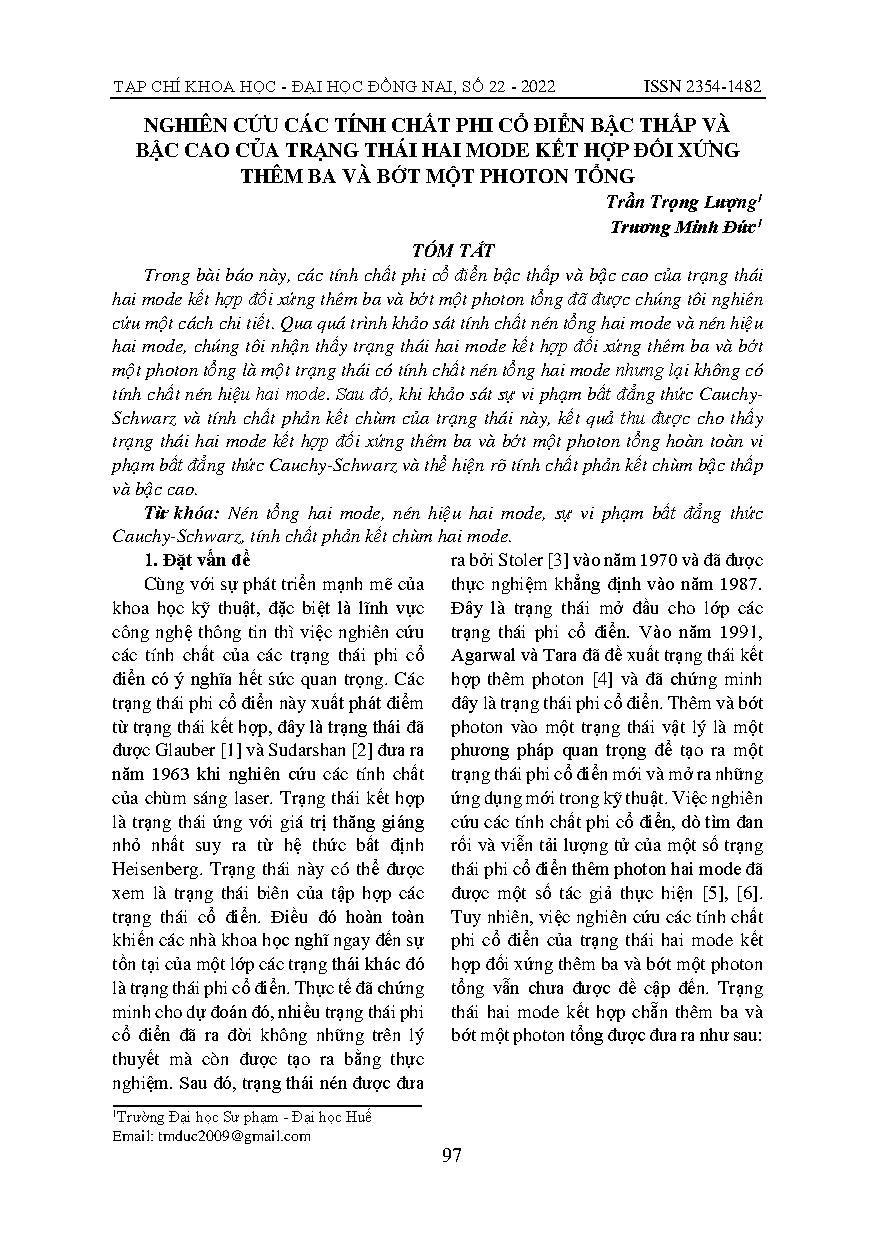 Nghiên cứu các tính chất phi cổ điển bậc thấp và bậc cao của trạng thái hai mode kết hợp đối xứng thêm ba và bớt một photon tổng = Studying the lower-order and the higher-order nonclassical properties of the three-photon-added and one-photon-subtracted tw