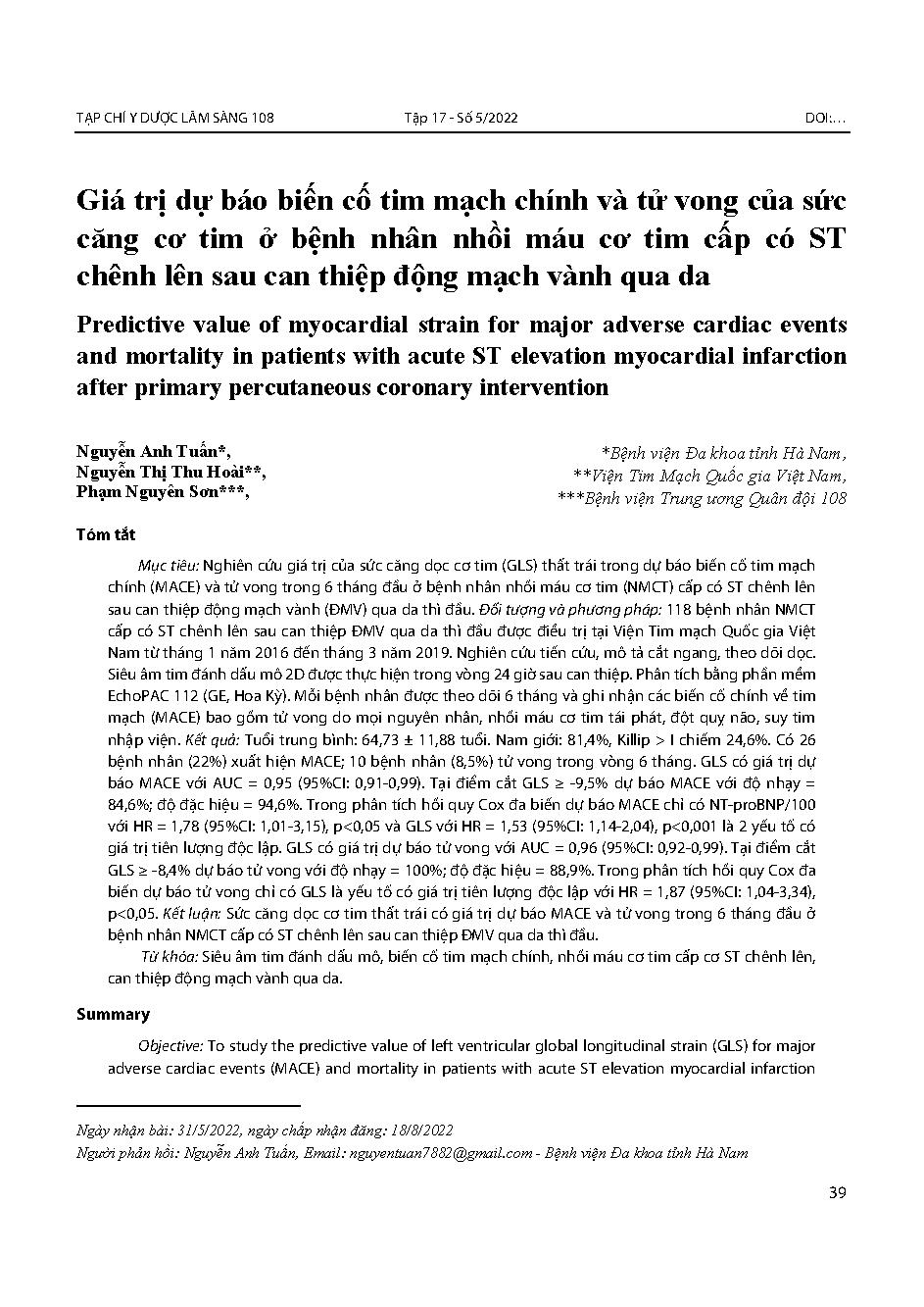 Giá trị dự báo biến cố tim mạch chính và tử vong của sức căng cơ tim ở bệnh nhân nhồi máu cơ tim cấp có ST chênh lên sau can thiệp động mạch vành qua da = Predictive value of myocardial strain for major adverse cardiac events and mortality in patients wit