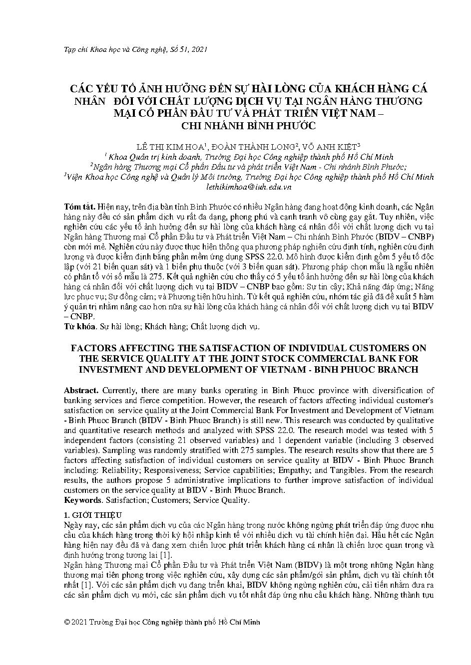 Các yếu tố ảnh hưởng đến sự hài lòng của khách hàng cá nhân đối với chất lượng dịch vụ tại ngân hàng thương mại cổ phần đầu tư và phát triển việt nam –chi nhánh bình phước = Factors affecting the satisfaction of individual customers on the service qualityat the joint stock commercial bank for investment and development of vietnam -binh phuoc branc