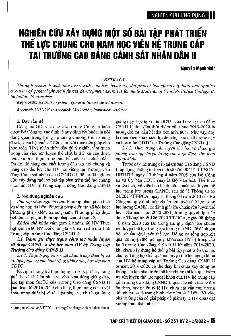 Nghiên cứu xây dựng một số bài tập phát triên thê lực chung cho nam học viên hệ trung cấp tại Trường Cao đẳng Cảnh sát nhân dân II = Researching and developing some general physical development exercises for male intermediate students at People’s Police C