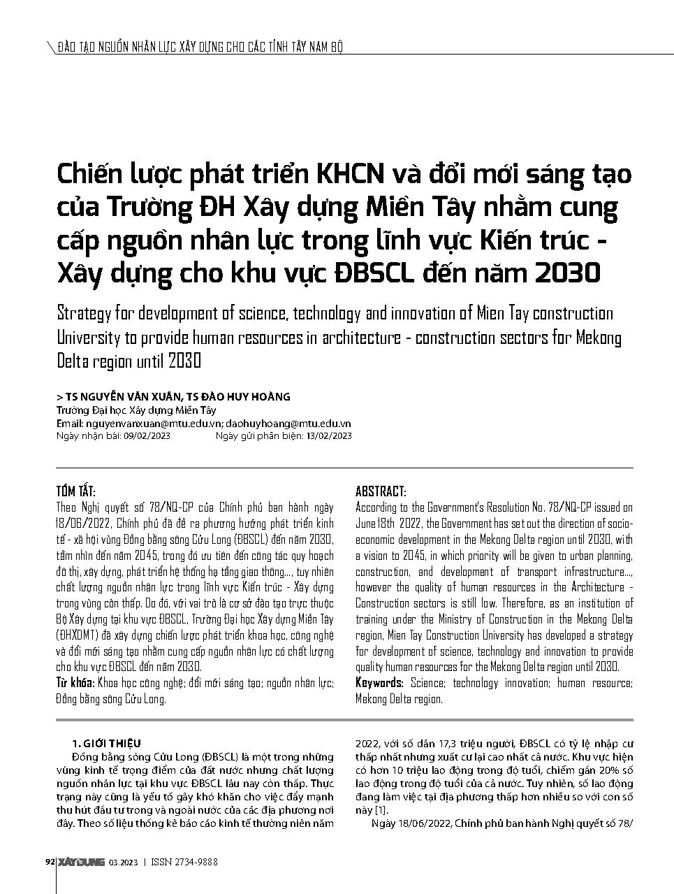 Chiến lược phát triển KHCN và đổi mới sáng tạo của Trường ĐH Xây dựng Miền Tây nhằm cung cấp nguồn nhân lực trong lĩnh vực Kiến trúc - Xây dựng cho khu vực ĐBSCL đến năm 2030 = Strategy for development of science, technology and innovation of Mien Tay con