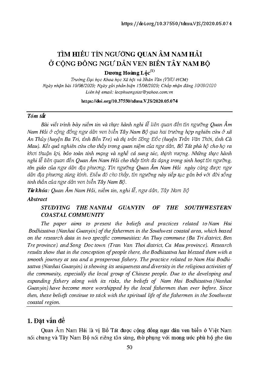 Tìm hiểu tín ngưỡng Quan Âm Nam Hải ở cộng đồng ngư dân ven biển tây Nam bộ = Studying the Nanhai Guanyin of the southwestern coastal community