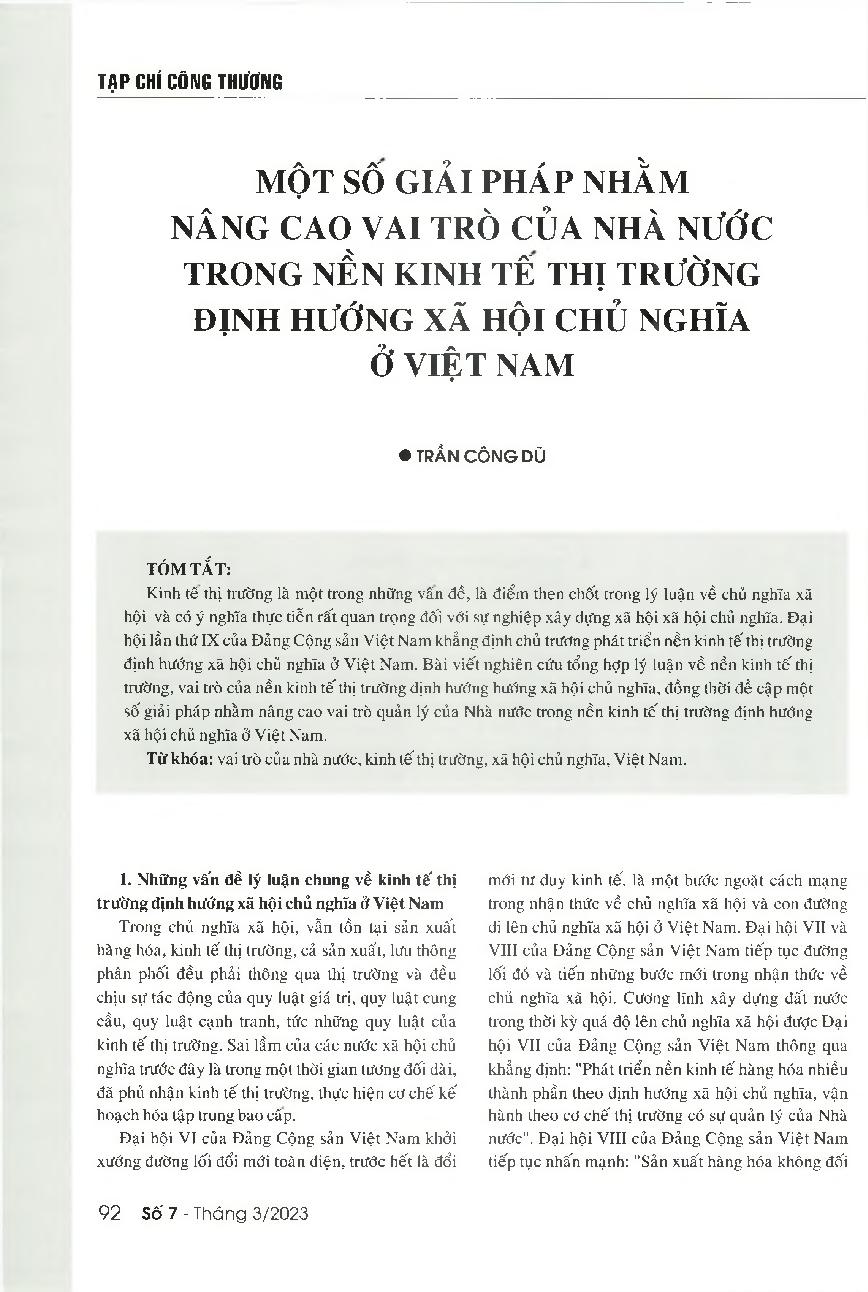 Một số giải pháp nhằm nâng cao vai trò của Nhà nước trong nền kinh tế thị trường định hướng xã hội chủ nghĩa ở Việt Nam = Some solutions to improve the role of the state management in the development of socialist-oriented market economy in Vietnam