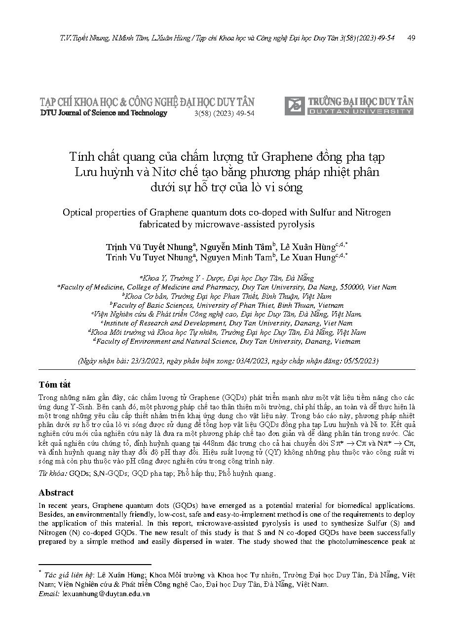 Tính chất quang của chấm lượng tử Graphene đồng pha tạp Lưu huỳnh và Nitơ chế tạo bằng phương pháp nhiệt phân dưới sự hỗ trợ của lò vi sóng