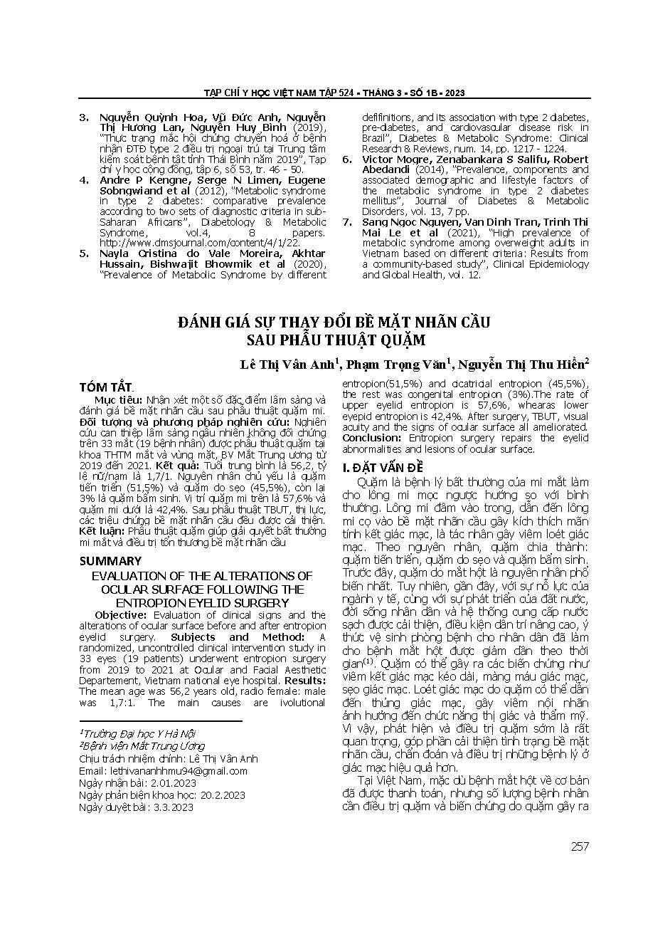 Đánh giá sự thay đổi bề mặt nhãn cầu sau phẫu thuật quặm = Evaluation of the alterations of ocular surface following the entropion eyelid surgery