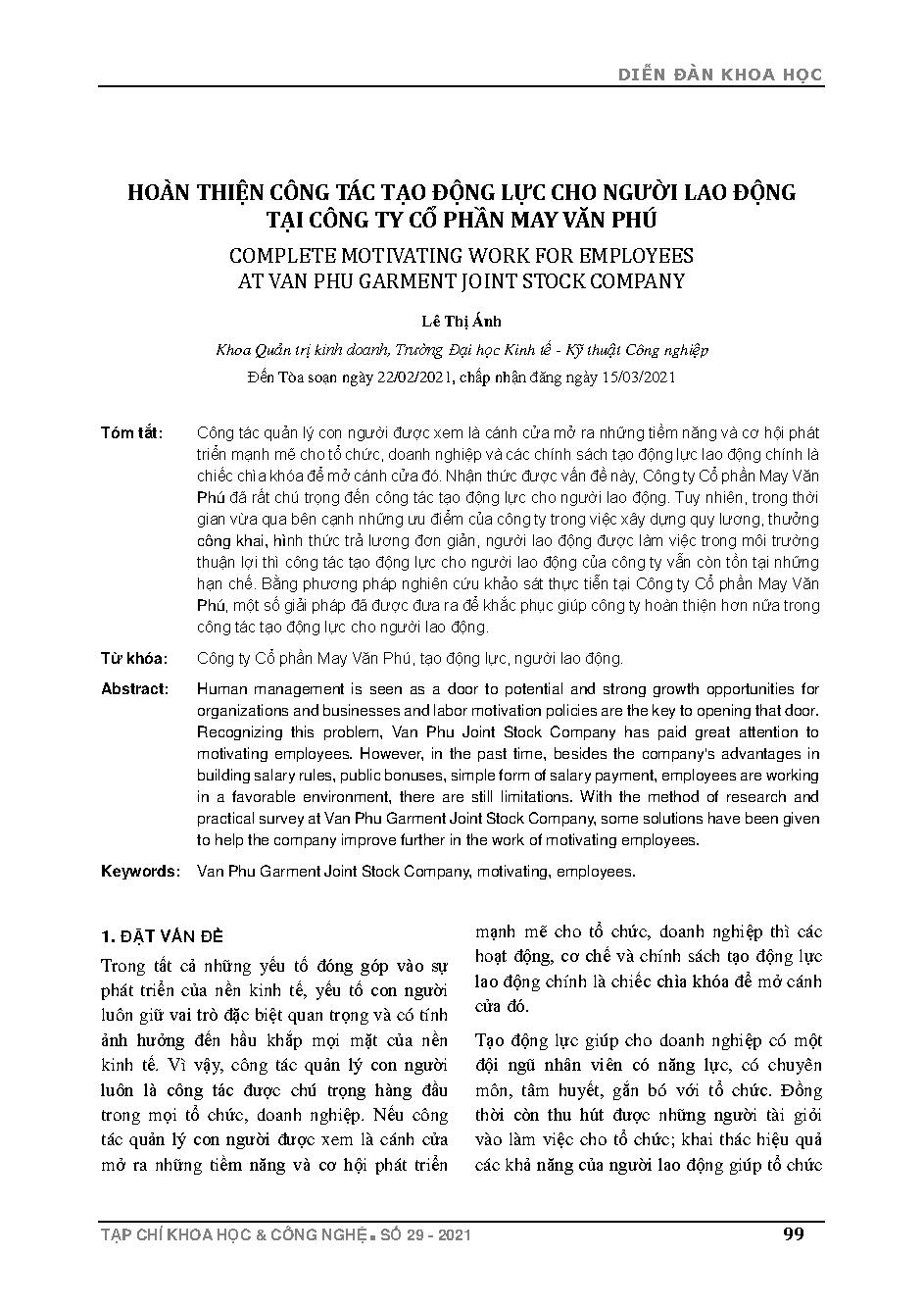Hoàn thiện công tác tạo động lực cho người lao động tại Công ty Cổ phần may Văn Phú
