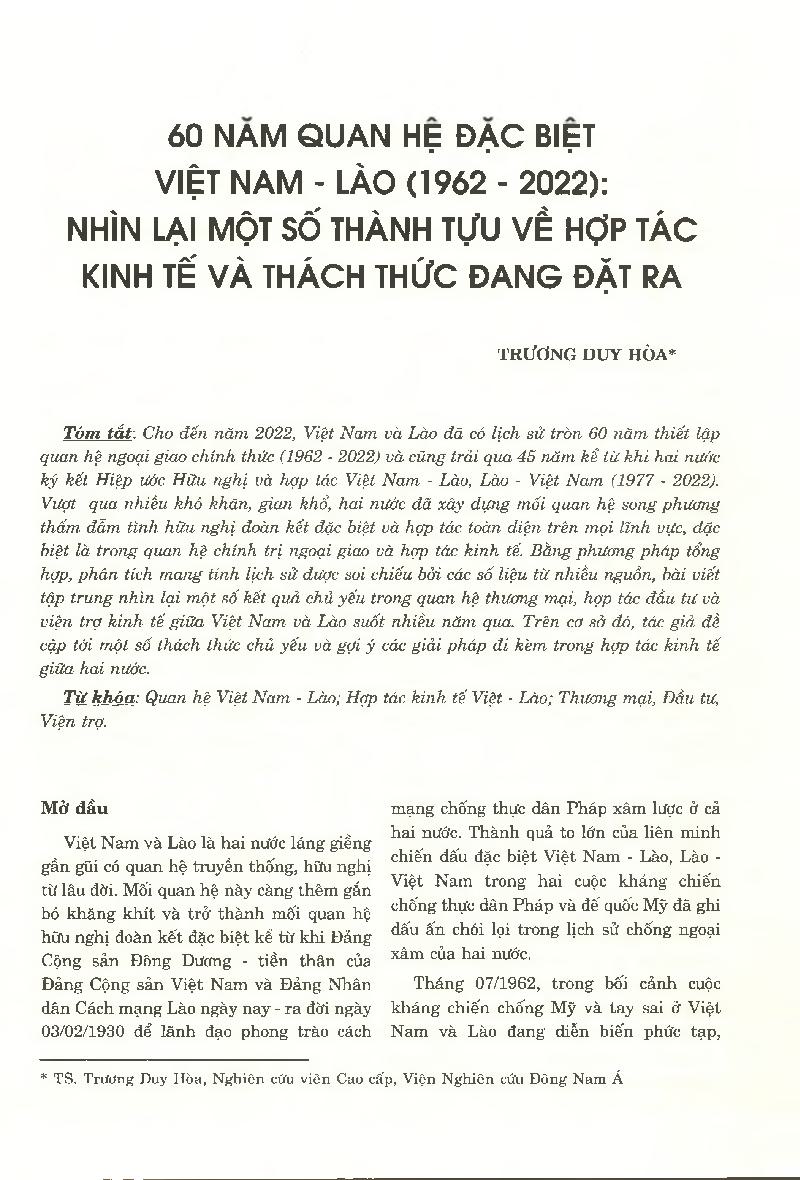 60 năm quan hệ đặc biệt Việt Nam - Lào (1962 - 2022): Nhìn lại một số thành tựu về hợp tác kinh tế và thách thức đang đặt ra