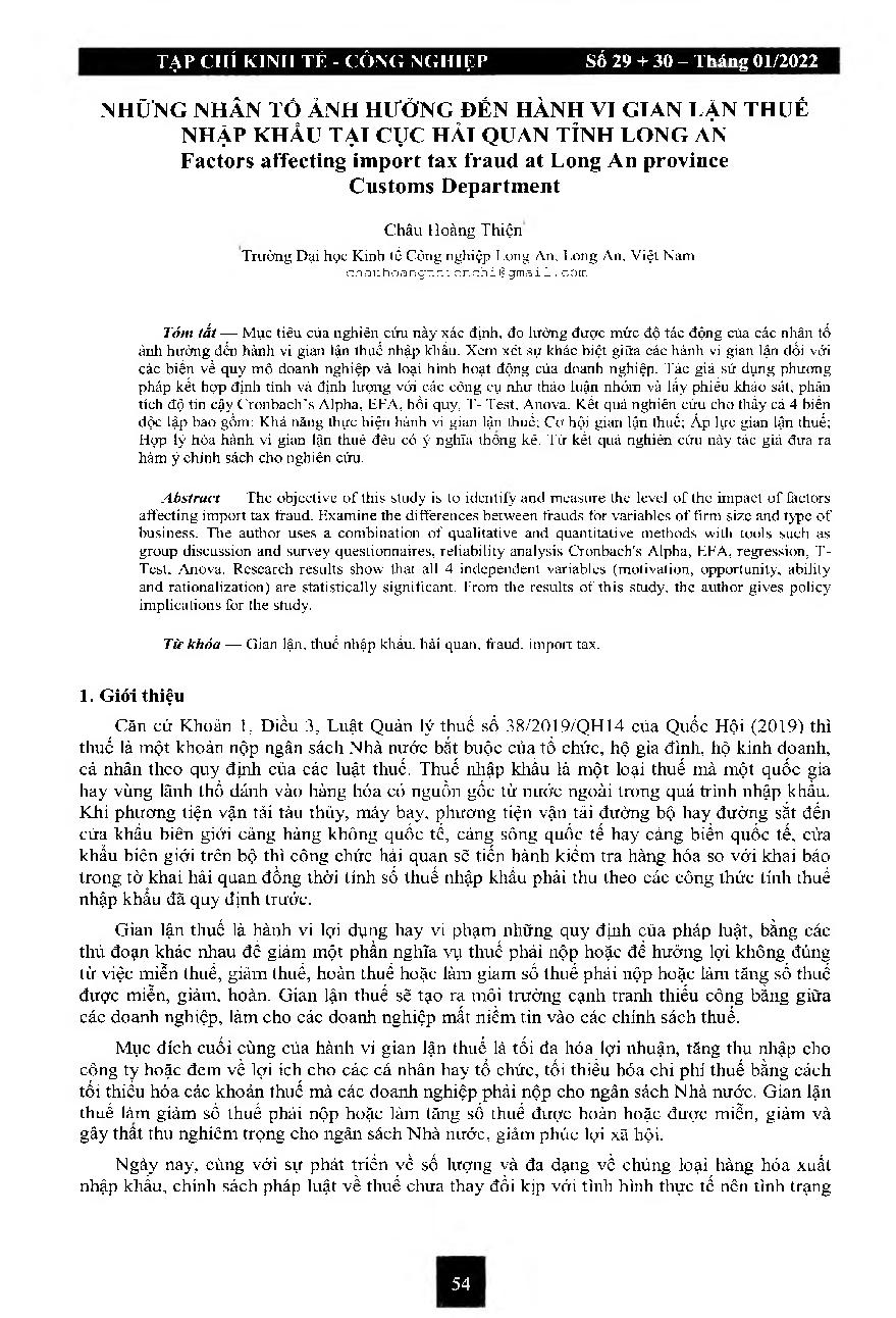 Những nhân tố ảnh hưởng đến hành vi gian lận thuế nhập khẩu tại cục hải quan tỉnh Long An = Factors affecting import tax fraud at Long An province Customs Department