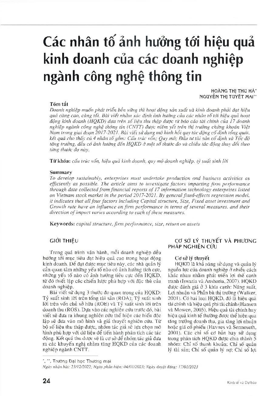 Các nhân tố ảnh hưởng tới hiệu quả kinh doanh của các doanh nghiệp ngành công nghệ thông tin = Factors affecting firm performance of information technology enterprises