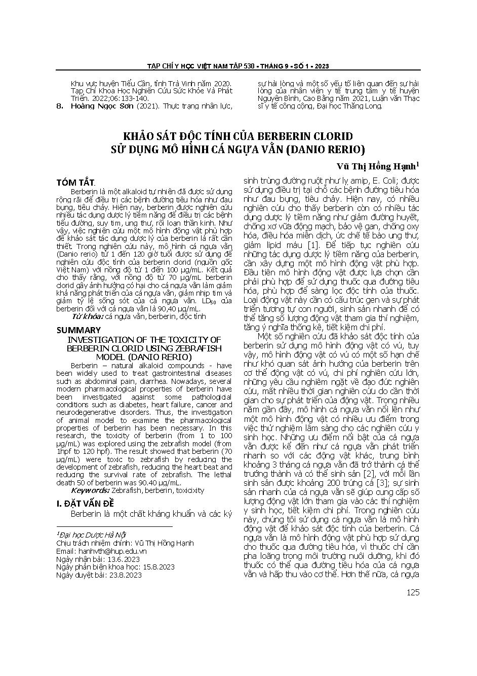 Khảo sát độc tính của berberin clorid sử dụng mô hình cá ngựa vằn (danio rerio) = Investigation of the toxicity of berberin clorid using zebrafish model (danio rerio)