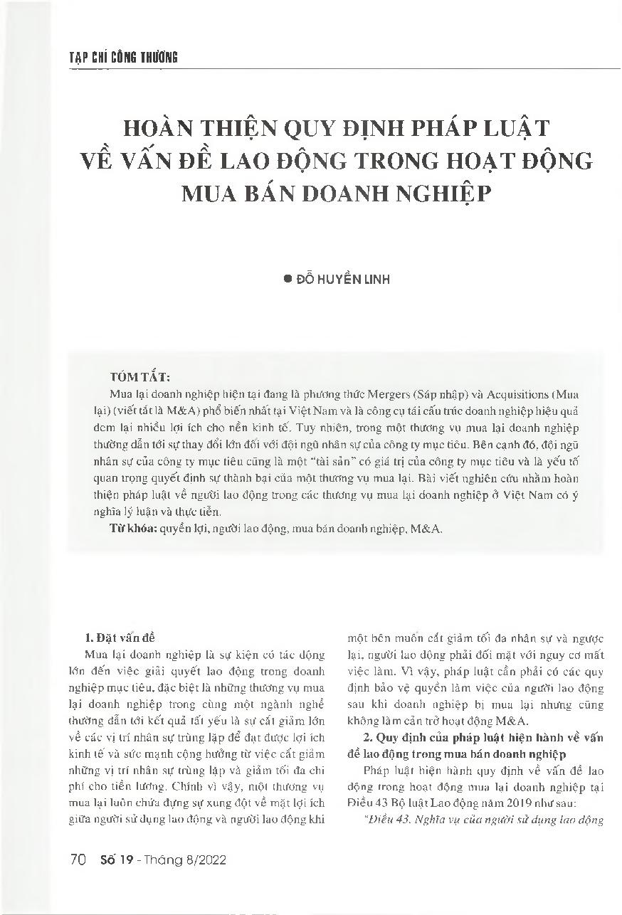 Hoàn thiện quy định pháp luật về vấn đề lao động trong hoạt động mua bán doanh nghiệp = Improving legal provisions on labour in acquisitions in Vietnam
