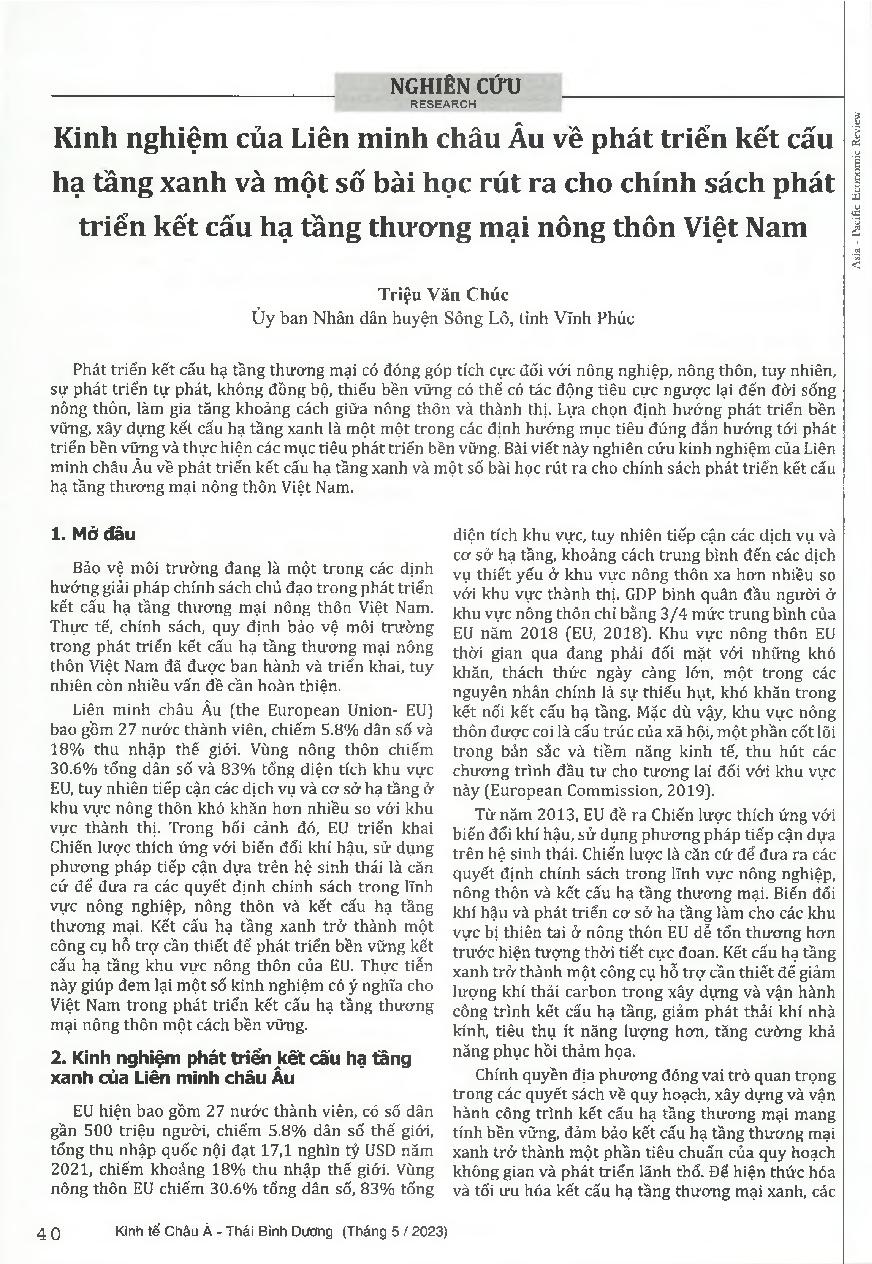 Kinh nghiệm của Liên minh châu u về phát triển kết cấu hạ tầng xanh và một số bài học rút ra cho chính sách phát triển kết cấu hạ tầng thương mại nông thôn Việt Nam