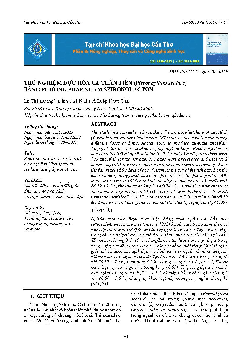 Thử nghiệm đực hóa cá thần tiên (Pterophyllum scalare) bằng phương pháp ngâm Spironolacton = Study on all-male sex reversal on angelfish (Pterophyllum scalare) using Spironolacton