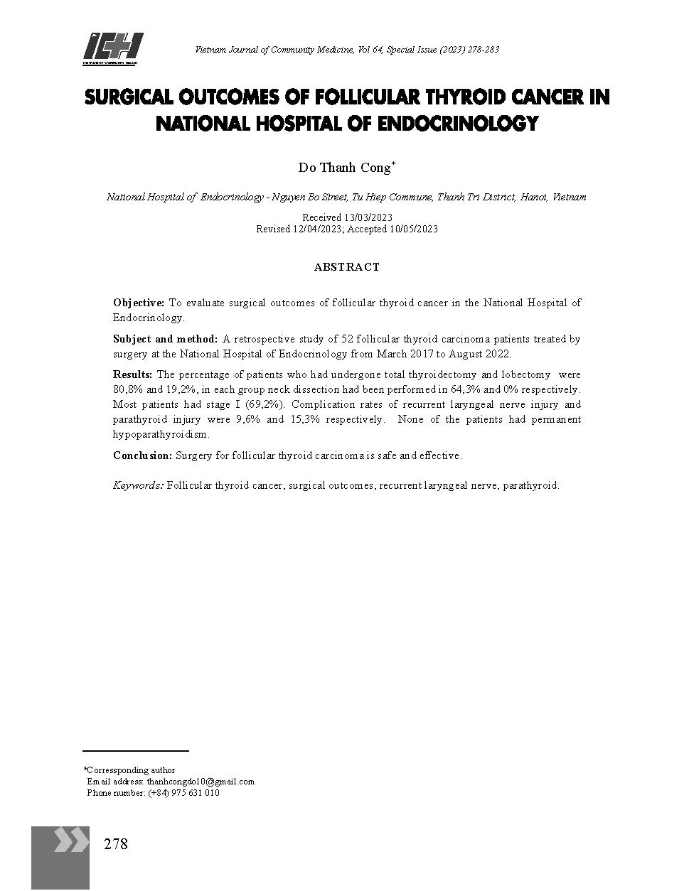 Kết quả phẫu thuật ung thư tuyến giáp thể nang tại Bệnh viện Nội tiết Trung ương = Surgical outcomes of follicular thyroid cancer in national Hospital of Endocrinology