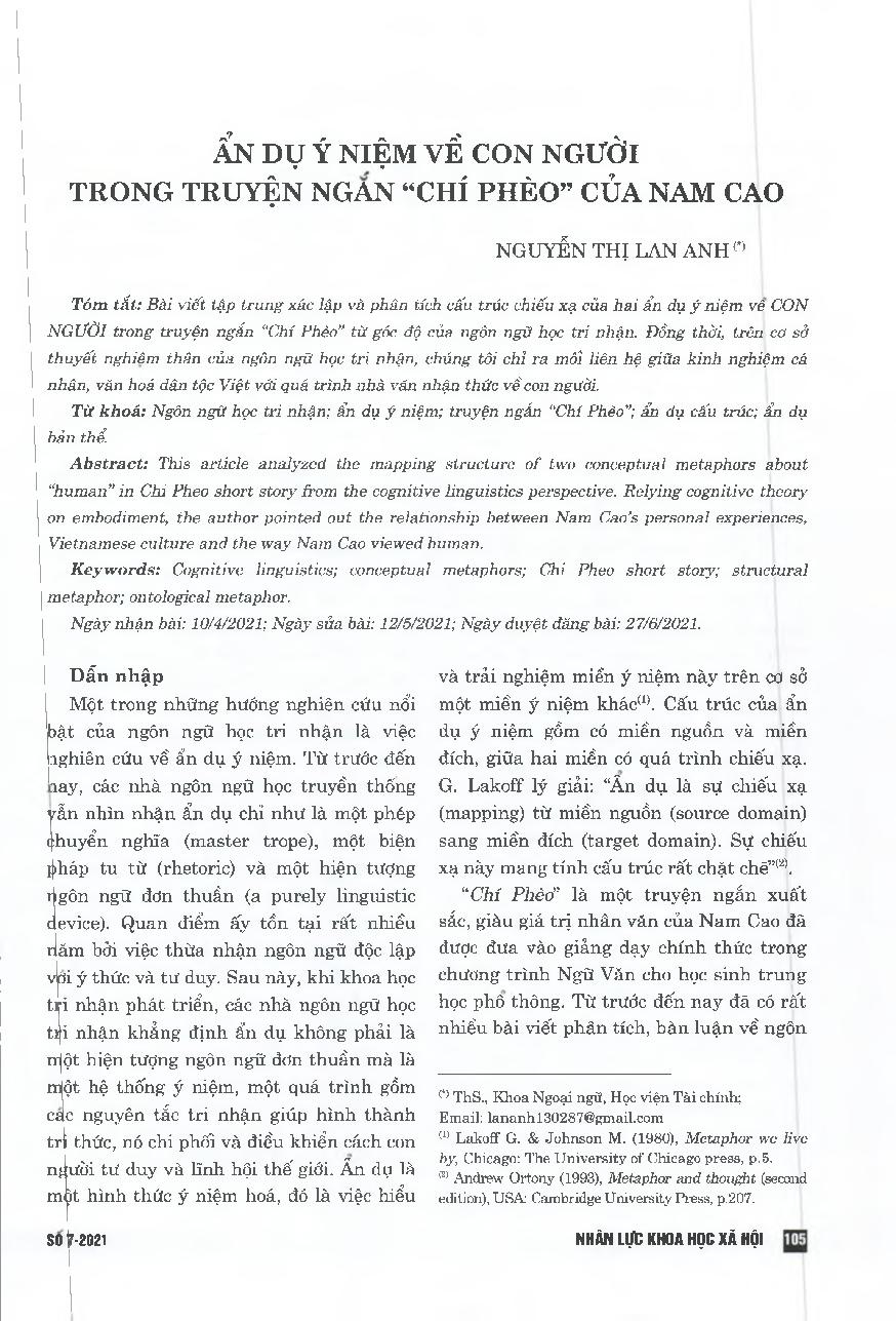 Ẩn dụ ý niệm về CON NGƯỜI trong truyện ngắn “Chí Phèo” của Nam Cao = Conceptual metaphor of HUMAN in Nam Cao's short story "Chi Pheo"