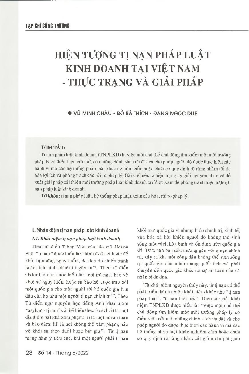 Hiện tượng tị nạn pháp luật kinh doanh tại Việt Nam - Thực trạng và giải pháp = The issue of business asylum in Vietnam - Status quo and solutions