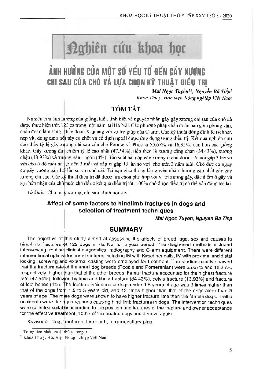 Ảnh hưởng của một số yếu tố đến gãy xương chi sau của chó và lựa chọn kỹ thuật điều trị = Affect of some factors to hindlimb fractures in dogs and selection of treatment techniques