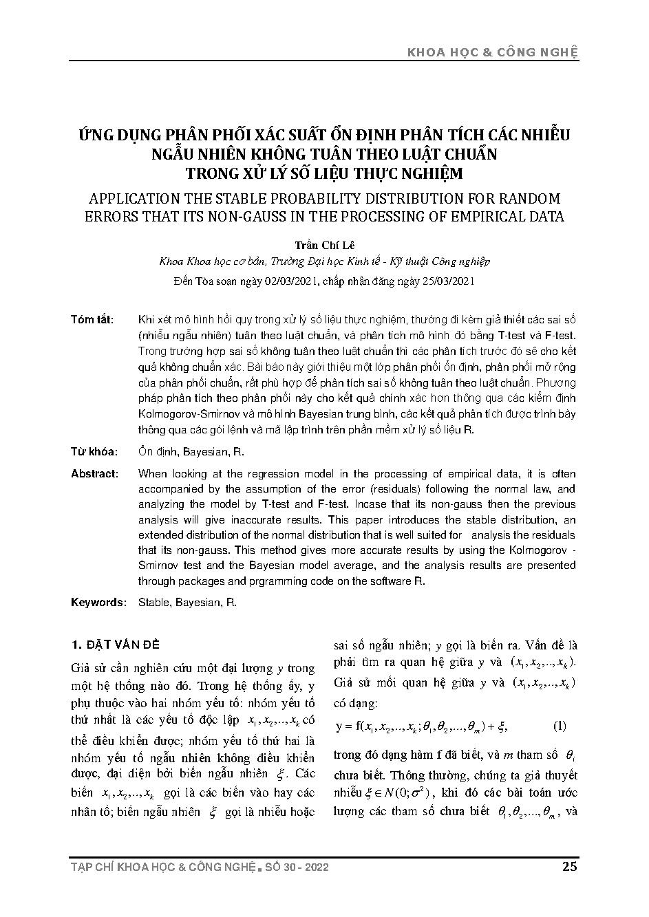 Ứng dụng phân phối xác suất ổn định phân tích các nhiễu ngẫu nhiên không tuân theo luật chuẩn trong xử lý số liệu thực nghiệm = Application the stable probability distribution for random errors that its non-gauss in the processing of empirical data