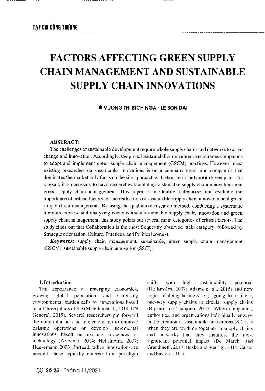 Các yếu tố ảnh hưởng đến quản lý chuỗi cung ứng xanh và đổi mới chuỗi cung ứng bền vững = Factors affecting green supply chain management and sustainable supply chain innovations