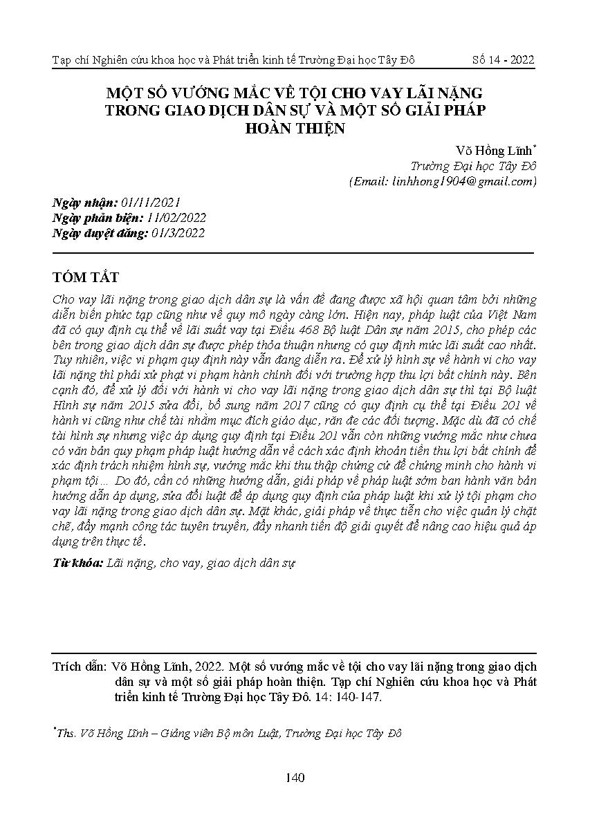 Một số vướng mắc về tội cho vay lãi nặng trong giao dịch dân sự và một số giải pháp hoàn thiện = Problems of high interest loan in civil transactions and solutions