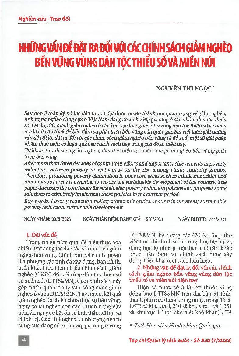 Những vấn đề đặt ra đối với các chính sách giảm nghèo bền vững vùng dân tộc thiểu số và miền núi = Issues facing sustainable poverty reduction policies in ethnic minority and mountainous areas