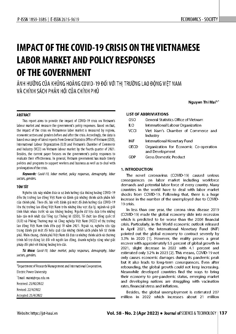 Ảnh hưởng của khủng hoảng covid-19 đối với thị trường lao động Việt Nam và chính sách phản hồi của chính phủ = Impact of the covid-19 crisis on the Vietnamese labor market and policy responses of the government