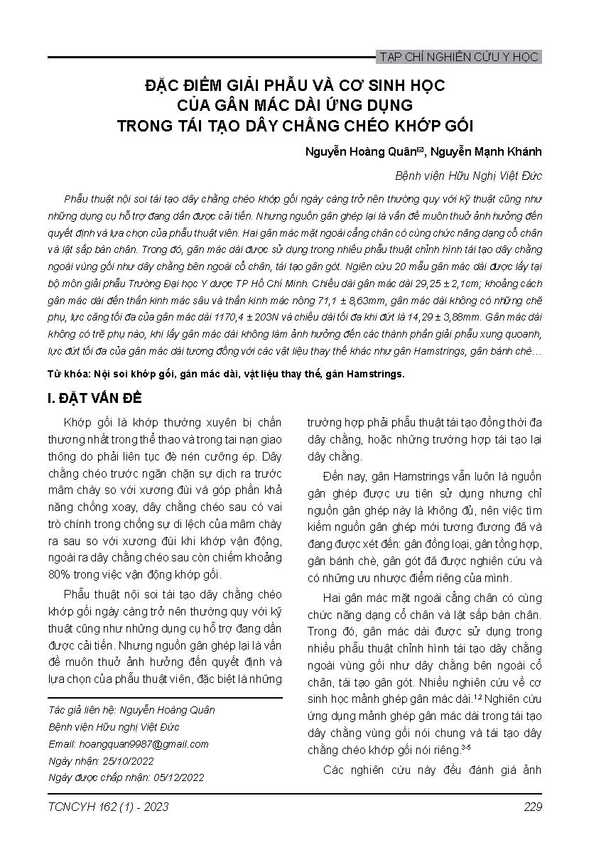 Đặc điểm giải phẫu và cơ sinh học của gân mác dài ứng dụng trong tái tạo dây chằng chéo khớp gối