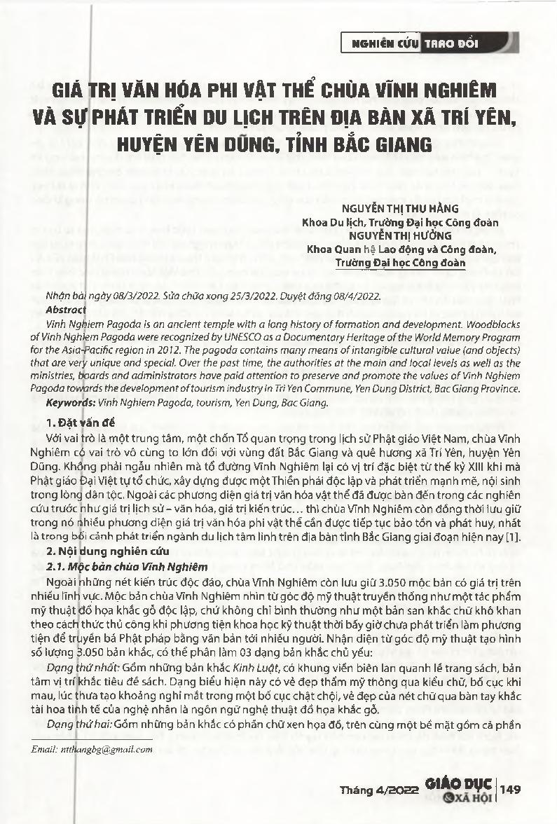 Giá trị văn hóa phi vật thể chùa Vĩnh Nghiêm và sự phát triển du lịch trên địa bàn xã Trí Yên, huyện Yên Dũng, tỉnh Bắc Giang = Intangible cultural value of Vinh Nghiem Pagoda and tourism development in Tri Yen Commune, Yen Dung District, Bac Giang Provin