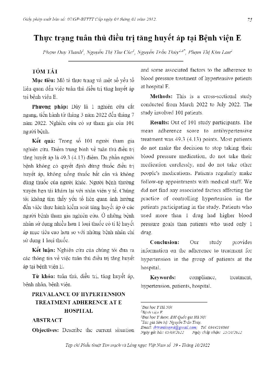 Thực trạng tuân thủ điều trị tăng huyết áp tại bệnh viện E = Prevalance of hypertension treatment adherence at E hospital