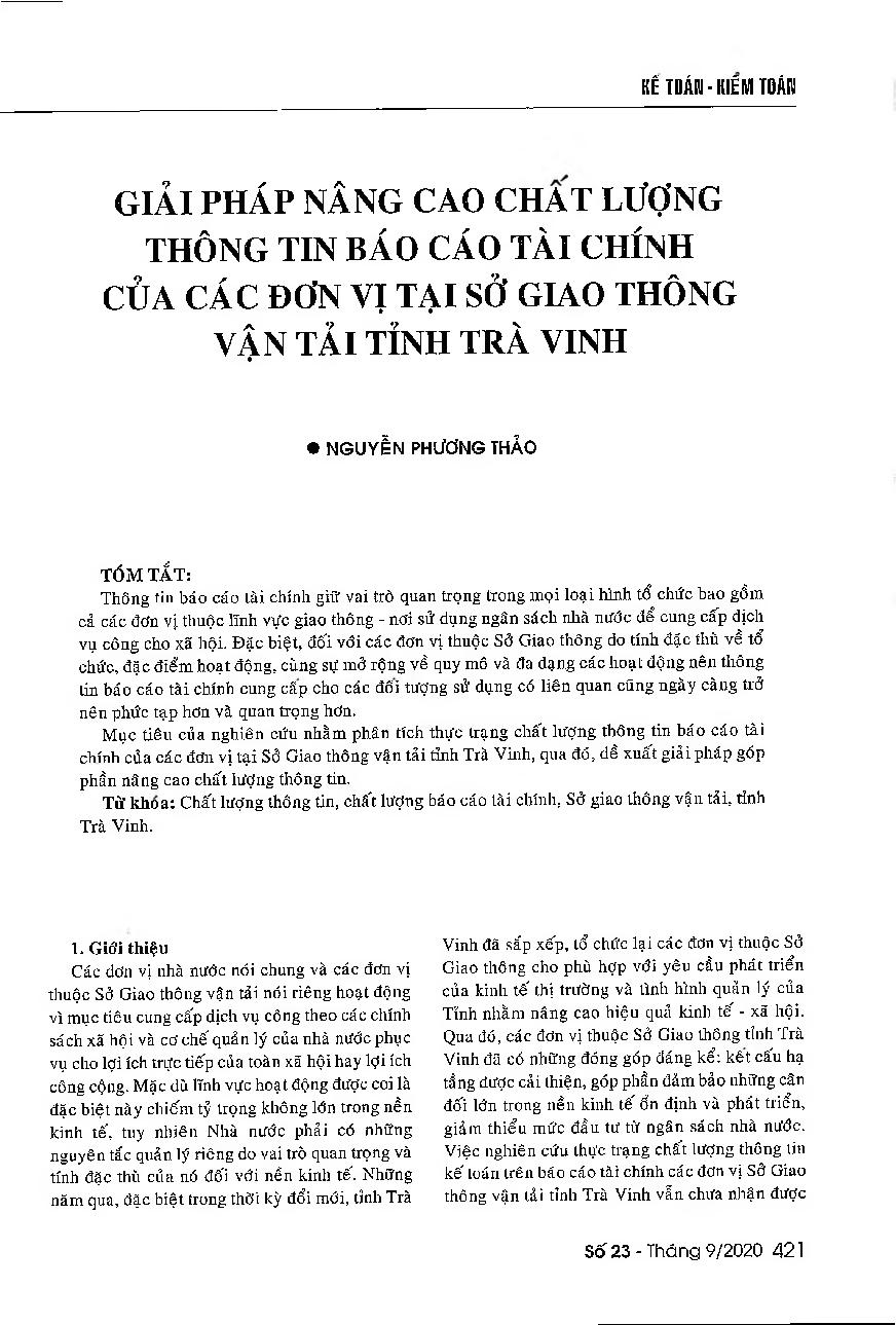 Giải pháp nâng cao chất lượng thông tin báo cáo tài chính của các đơn vị tại sở Giao thông vận tải tỉnh Trà Vinh = Solutions for improving the information quality of financial statements provided by units under the Department of Transport - Tra Vinh Province