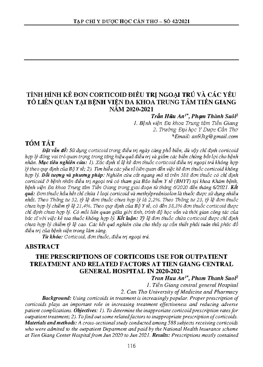 TÌNH HÌNH KÊ ĐƠN CORTICOID ĐIỀU TRỊ NGỌAI TRÚ VÀ CÁC YẾU TỐ LIÊN QUAN TẠI BỆNH VIỆN ĐA KHOA TRUNG TÂM TIỀN GIANG NĂM 2020-2021 = THE PRESCRIPTIONS OF CORTICOIDS USE FOR OUTPATIENT TREATMENT AND RELATED FACTORS AT TIEN GIANG CENTRAL GENERAL HOSPITAL IN 2020-2021