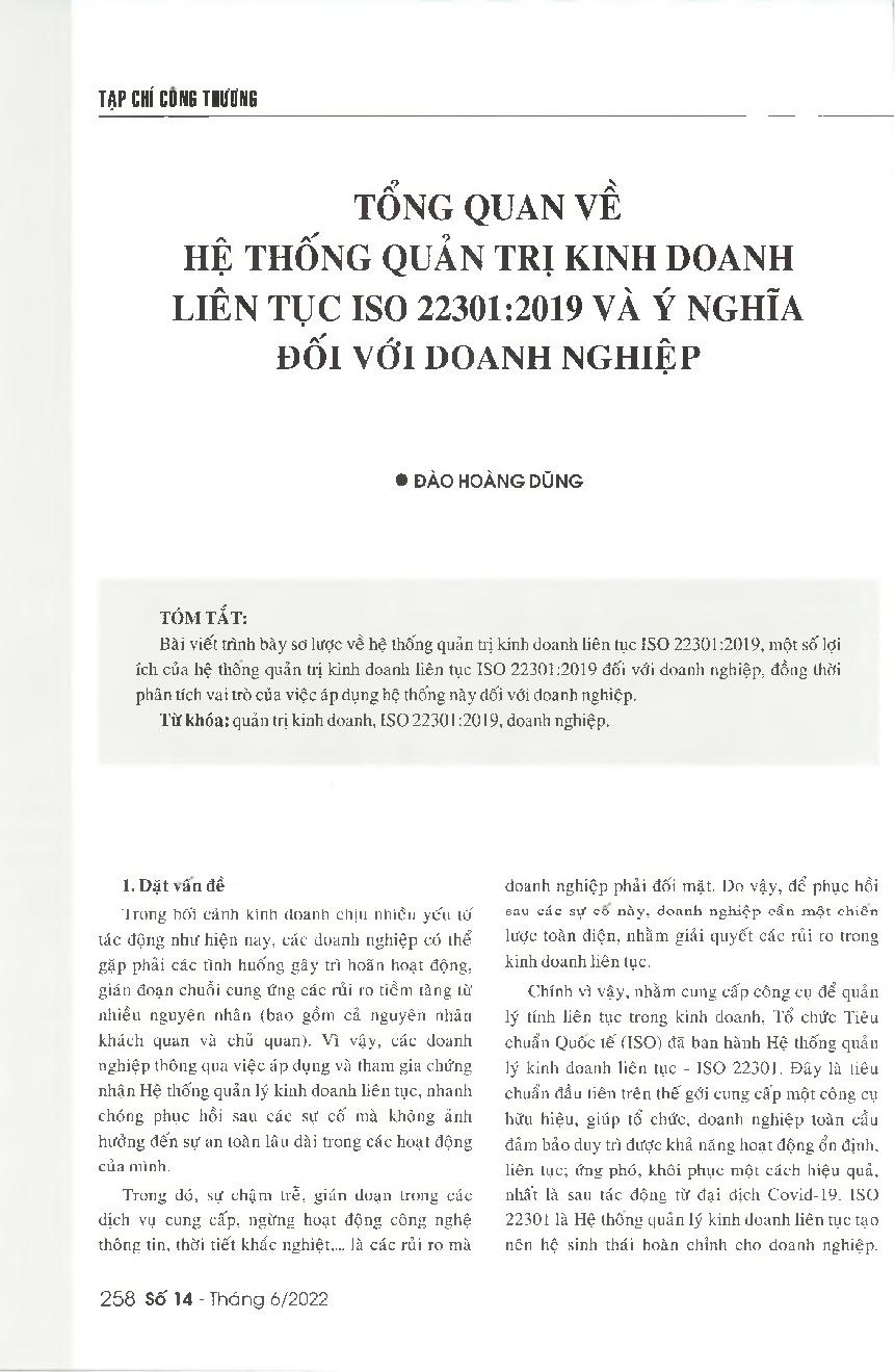 Tổng quan về hệ thống quản trị kinh doanh liên tục ISO 22301:2019 và ý nghĩa đối với doanh nghiệp = An overview of the ISO ISO 22301:2019 business continuity management system and its role for enterprises
