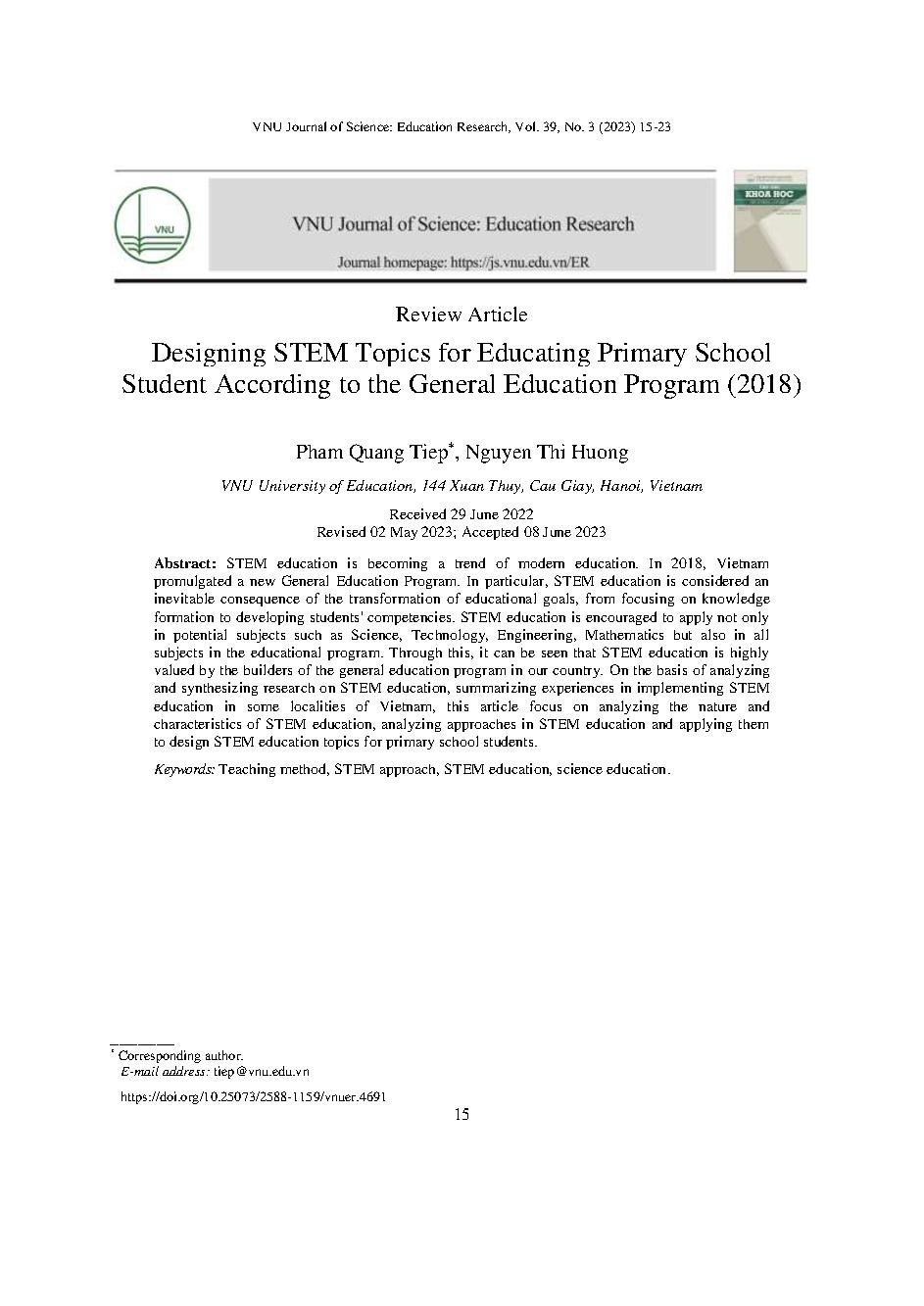 Thiết kế chủ đề giáo dục STEM cho học sinh tiểu học theo chương trình giáo dục phổ thông 2018 = Designing STEM Topics for Educating Primary School Student According to the General Education Program (2018)