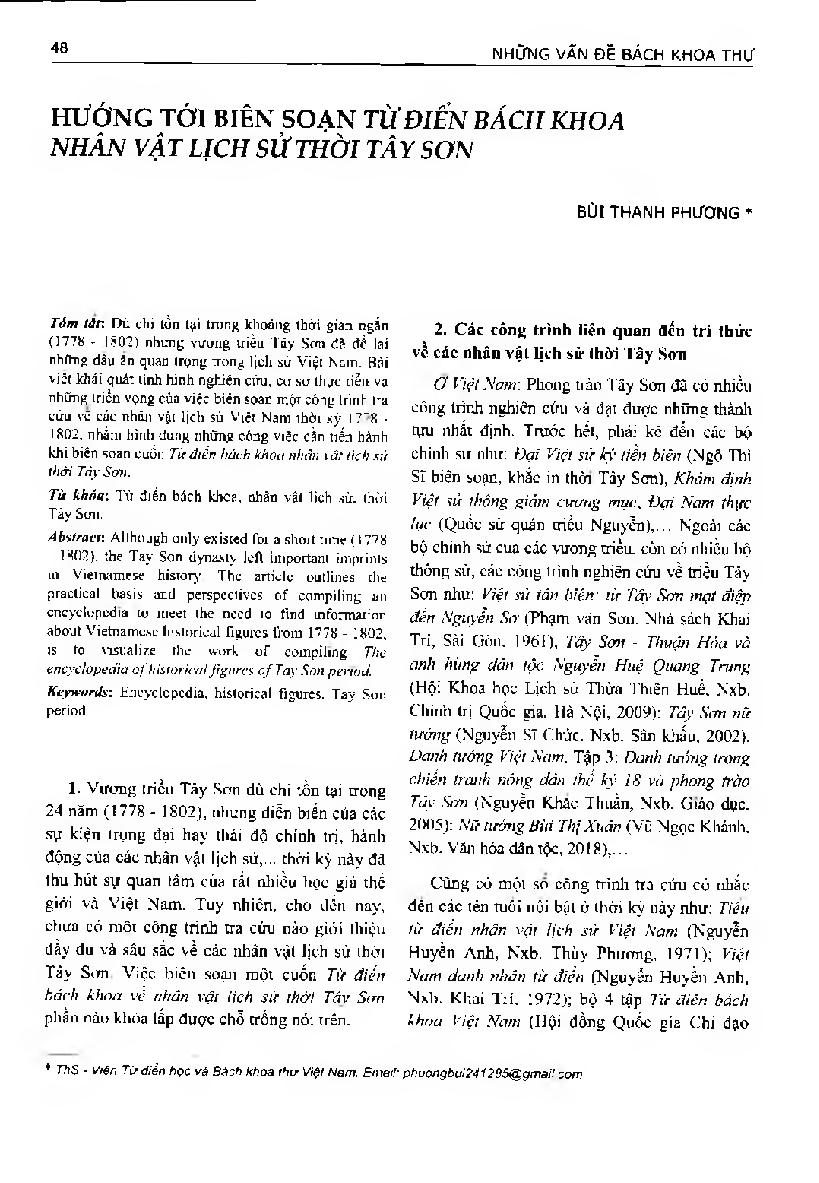 Hướng tới biên soạn Từ điển bách khoa nhân vật lịch sử thời Tây Sơn = Towards compiling "The encyclopedia of histori cal figures of Tay Son period"
