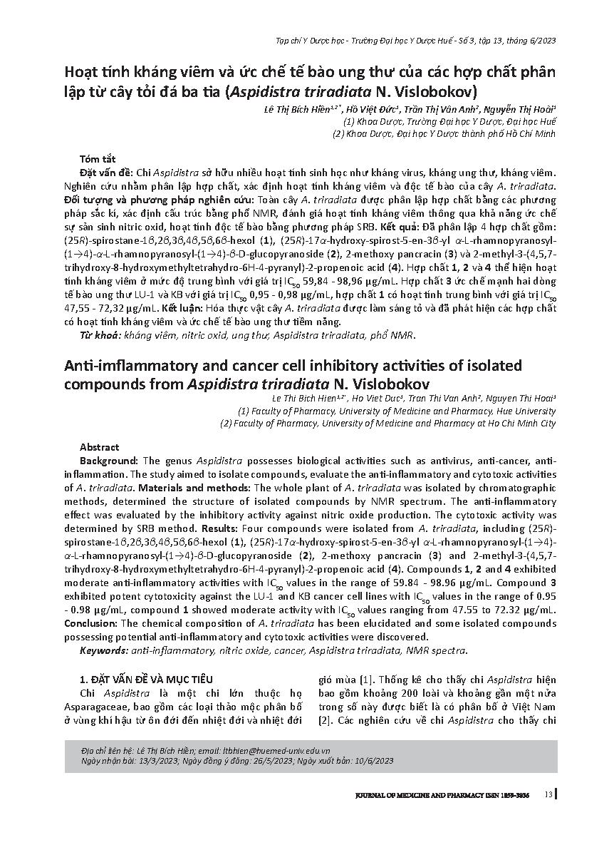 Hoạt tính kháng viêm và ức chế tế bào ung thư của các hợp chất phân lập từ cây tỏi đá ba tia (Aspidistra triradiata N. Vislobokov) = Anti-imflammatory and cancer cell inhibitory activities of isolated compounds from Aspidistra triradiata N. Vislobokov