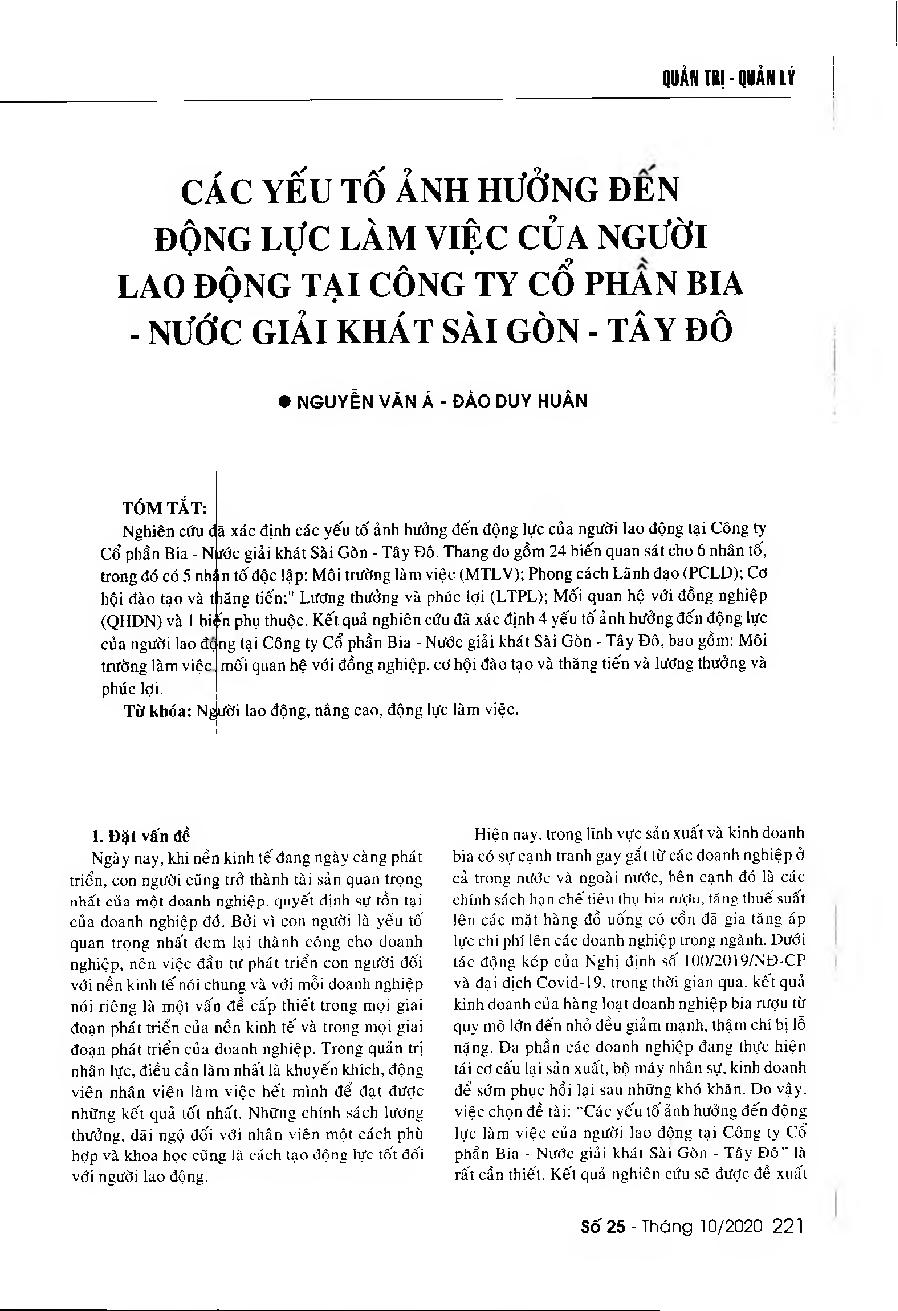 Các yếu tố ảnh hưởng đến động lực làm việc của người lao động tại công ty cổ phần Bia - Nước giải khát Sài Gòn - Tây Đô = Factors affecting the work motivation of employees working for Saigon - Tay Do Beer - Beverage Joint Stock Company