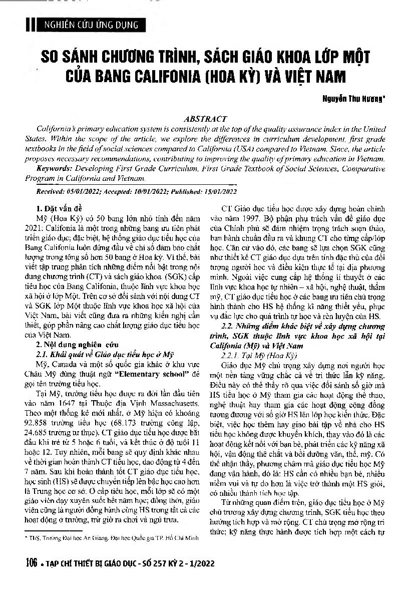 So sánh chương trình sách giáo khoa lớp một của bang California (Hoa kỳ) và Việt Nam = Comparing First Grade 106 Programs and Textbooks in the US and Vietnam