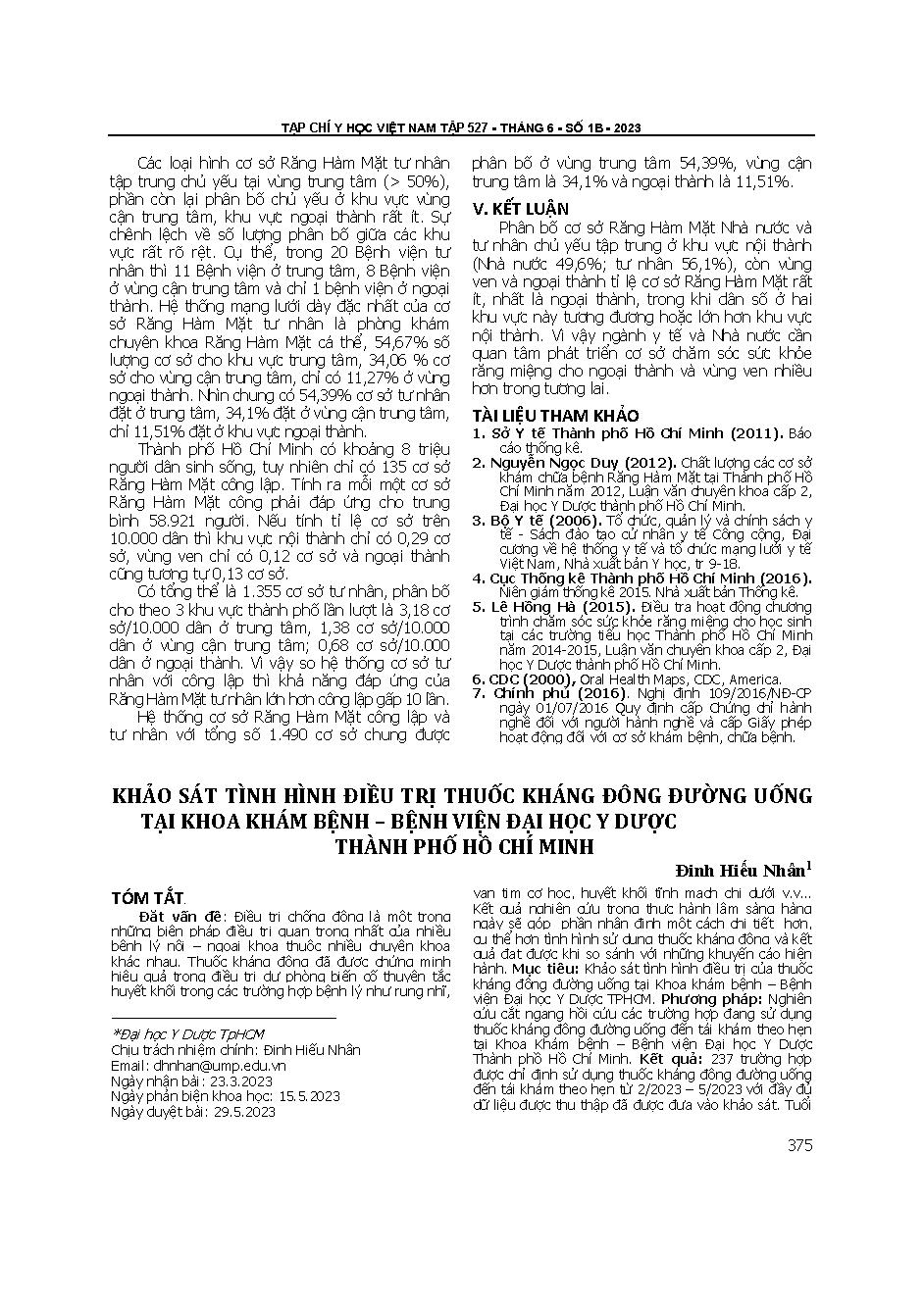 Khảo sát tình hình điều trị thuốc kháng đông đường uống tại Khoa Khám bệnh - Bệnh viện Đại học Y dược thành phố Hồ Chí Minh = Survey of situation of oral anticoagulant treatment at outpatient department - university medical center Ho Chi Minh city