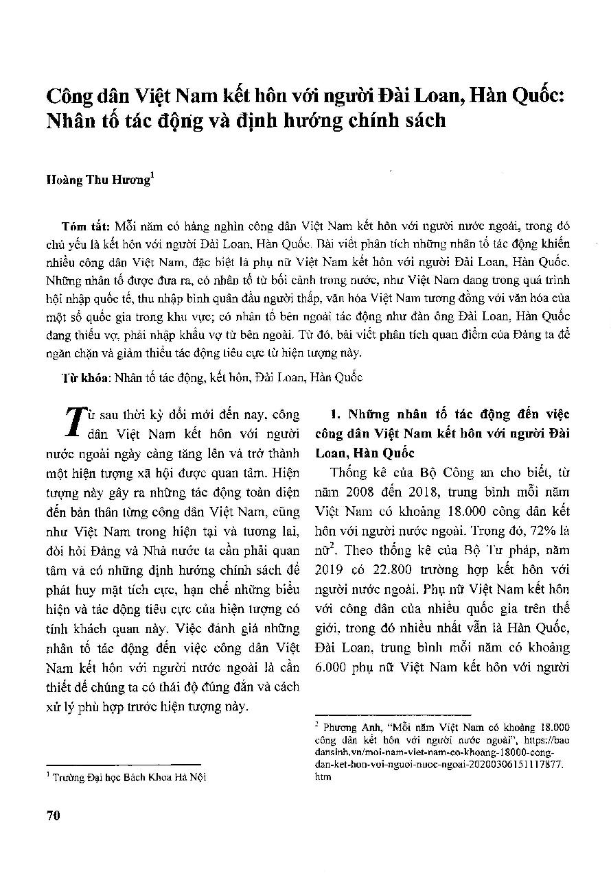 Công dân Việt Nam kết hôn với người Đài Loan, Hàn Quốc: Nhân tố tác động và định hướng chính sách