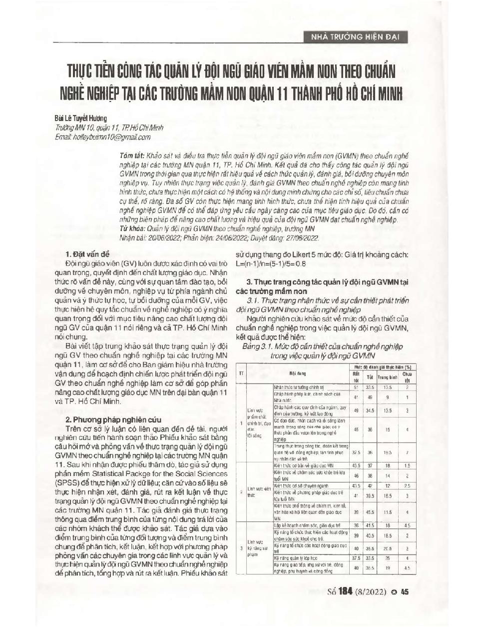 Thực tiễn công tác quản lý đội ngũ giáo viên mầm non theo tiêu chuẩn nghề nghiệp tại các trường mầm non quận 11, thành phố Hồ Chí Minh