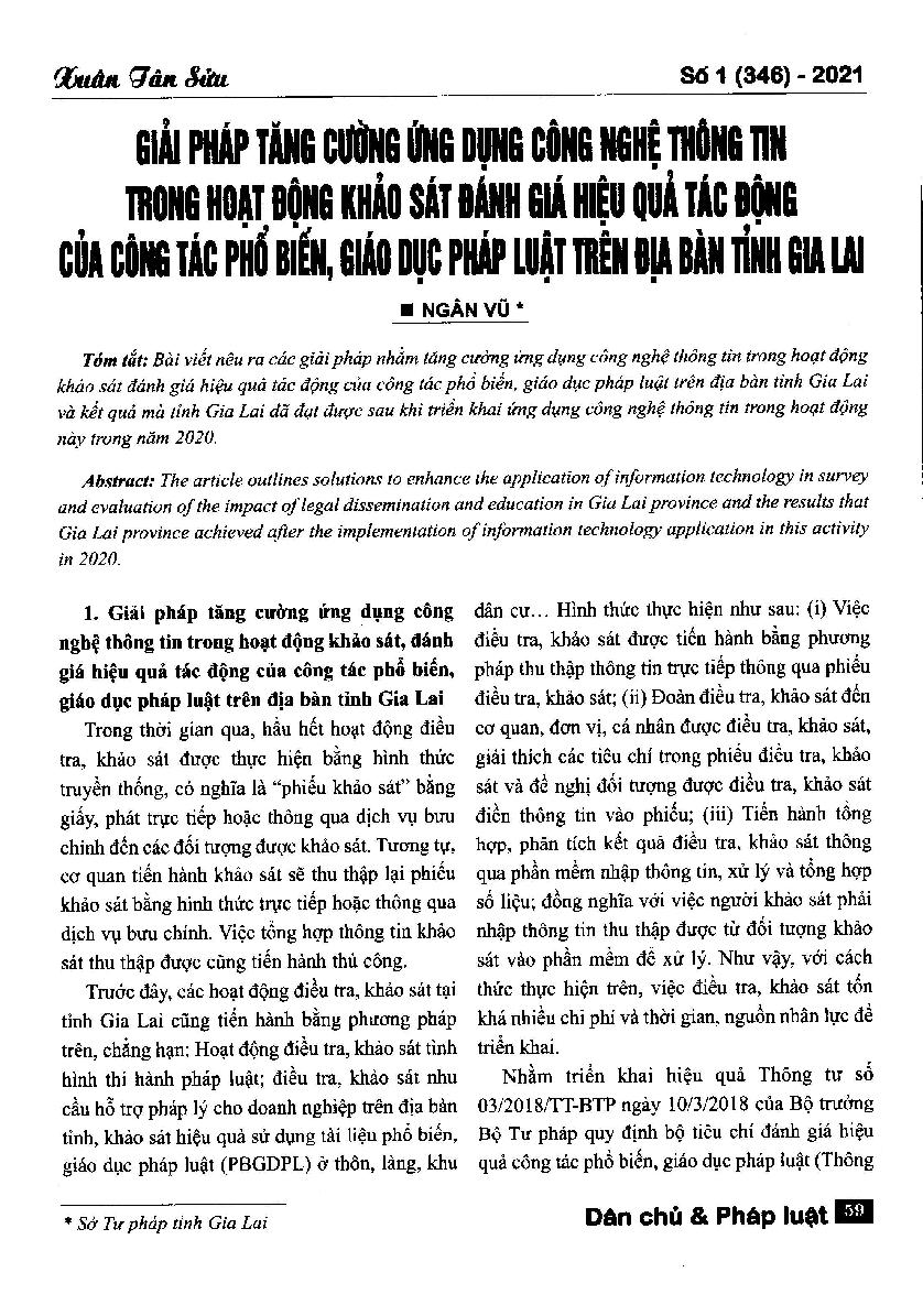 Giải pháp tăng cường ứng dụng công nghệ thông tin trong hoạt động khảo sát đánh giá hiệu quả tác động của công tác phổ biến, giáo dục pháp luật trên địa bàn tỉnh Gia Lai