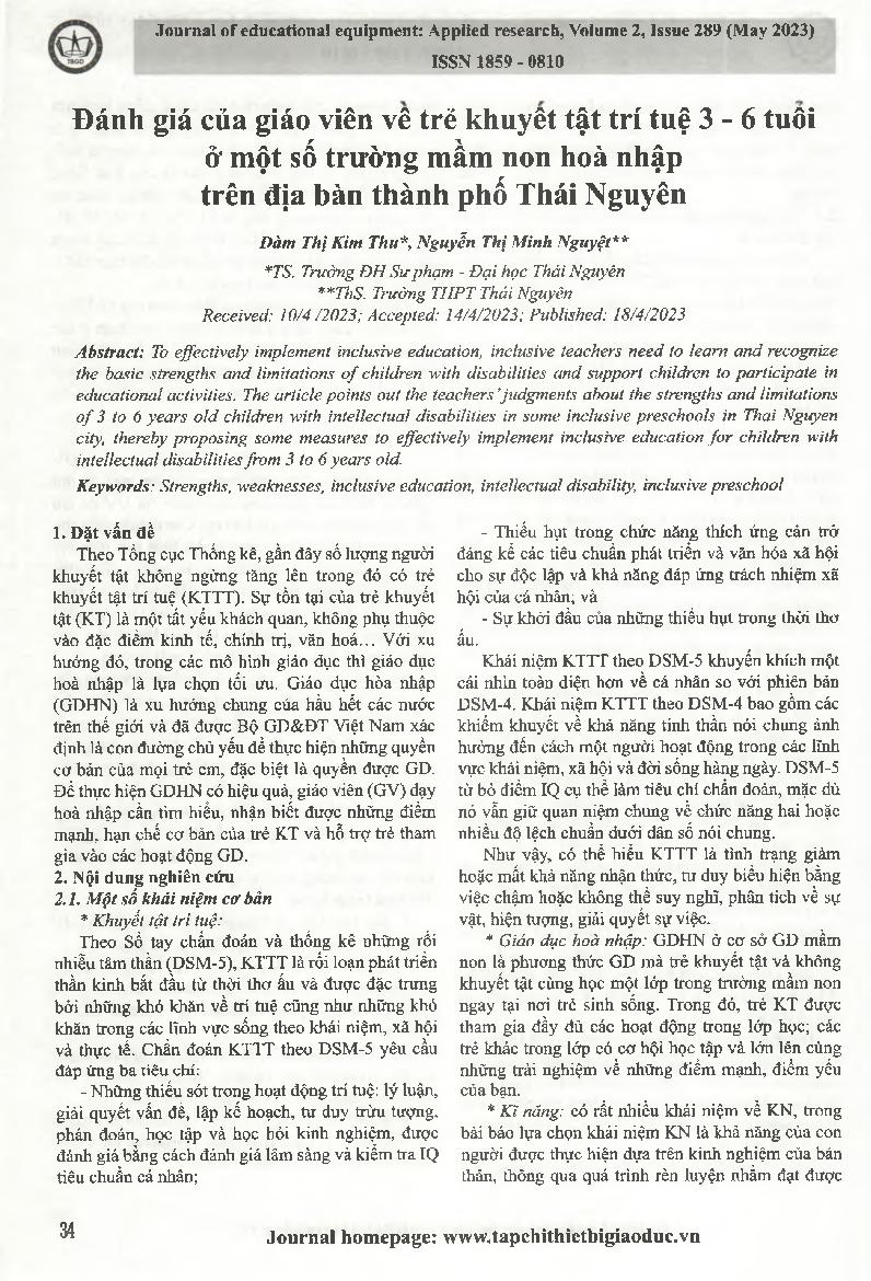 Đánh giá của giáo viên về trẻ khuyết tật trí tuệ 3-6 tuổi ở một số trường mầm non hoà nhập trên địa bàn thành phố Thái Nguyên = Evaluation of teachers about children with intellectual disabilities aged 3 - 6 in some inclusive preschools in Thai Nguyen cit