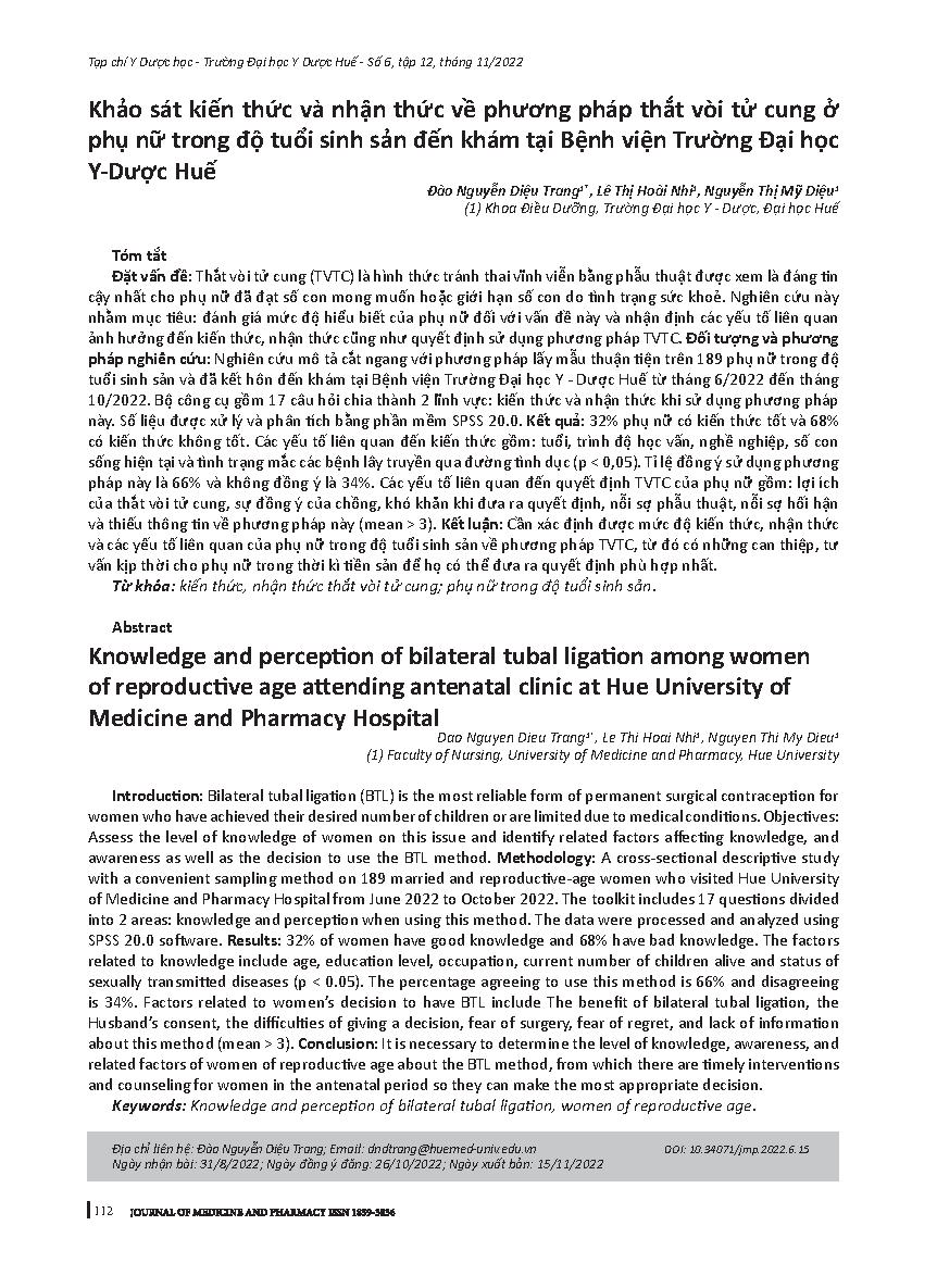 Khảo sát kiến thức và nhận thức về phương pháp thắt vòi tử cung ở phụ nữ trong độ tuổi sinh sản đến khám tại Bệnh viện Trường Đại học Y-Dược Huế = Knowledge and perception of bilateral tubal ligation among women of reproductive age attending antenatal cli