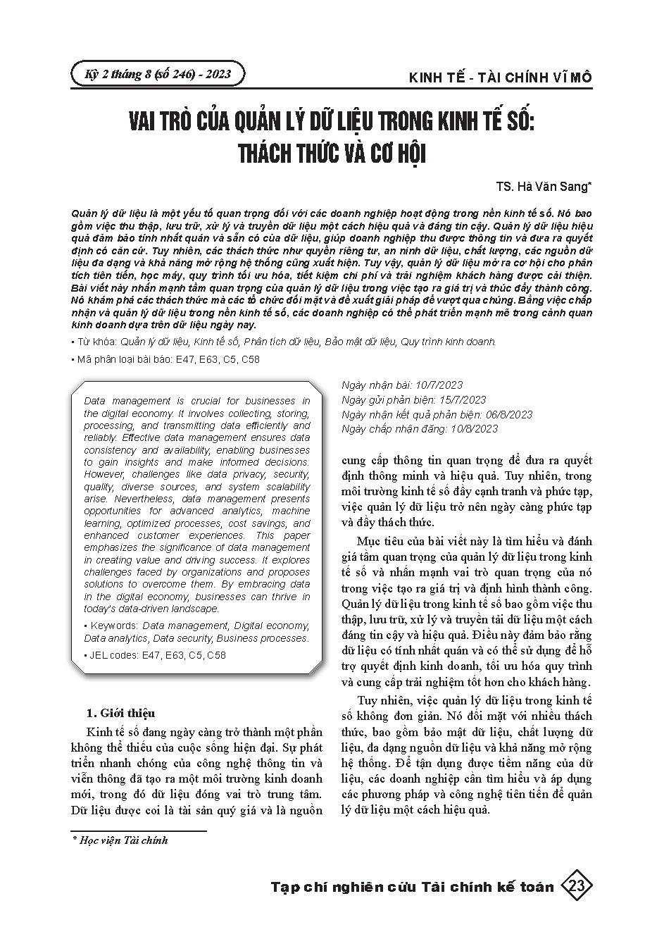Vai trò của quản lý dữ liệu trong kinh tế số: Thách thức và cơ hội = The role of data management in the digital economy: Challenges and opportunities