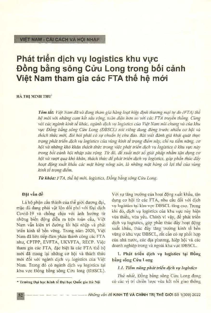 Phát triển dịch vụ logistics khu vực Đồng bằng sông Cửu Long trong bối cảnh Việt Nam tham gia các FTA thế hệ mới = Developing logistics services in the Mekong Delta in the context of Vietnam&; 39;s participation in new generation FTAs